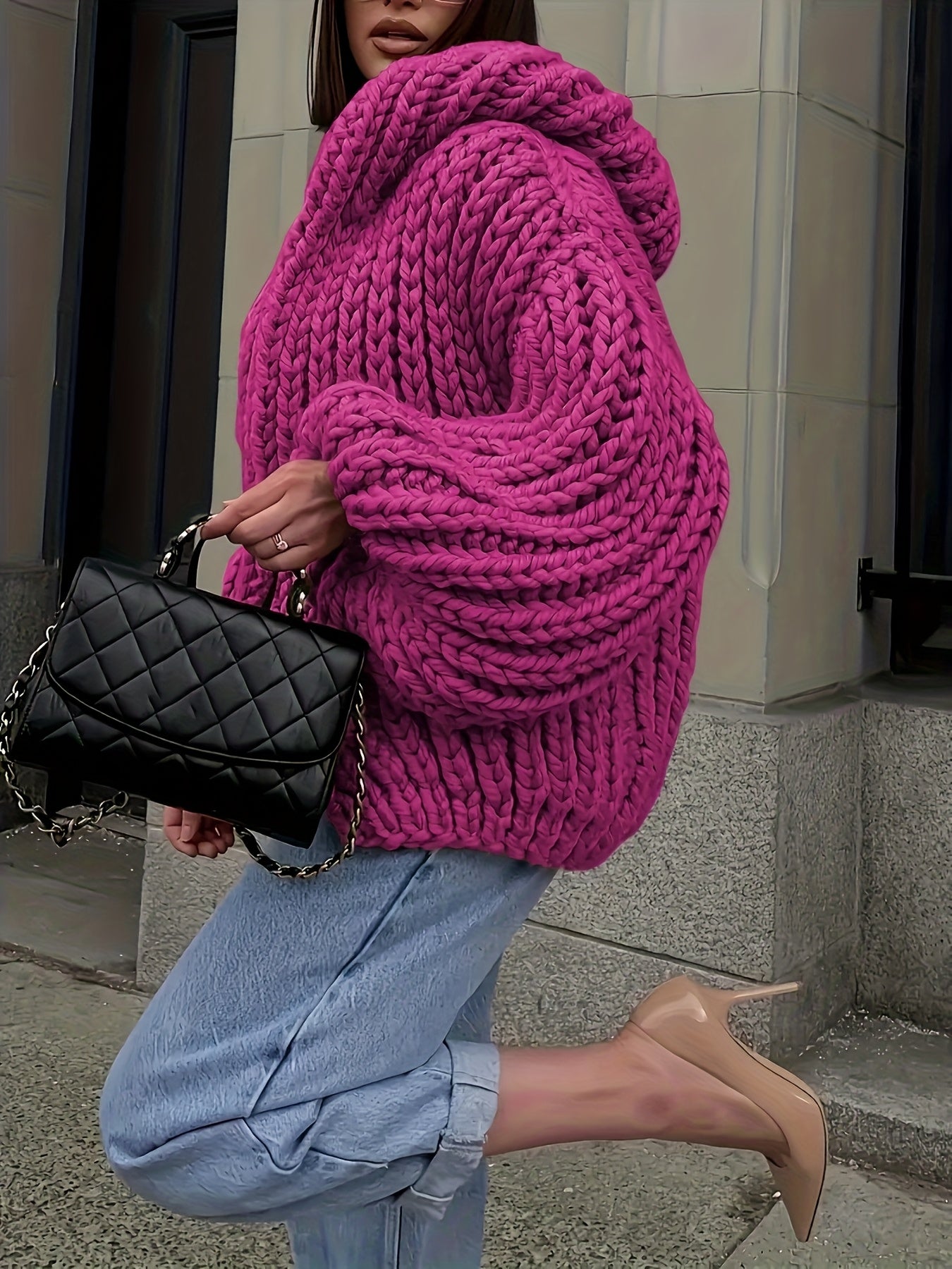 Diese Kapuzenjacke beeindruckt mit ihrem voluminösen Maschenbild und den weit geschnittenen Ärmeln. Das offene Design sorgt für eine lässige Silhouette, während die strukturierte Strickoptik dem Look eine modische Tiefe verleiht. Perfekt für kühle Tage, Stadtbummel oder entspannte Momente im Alltag.