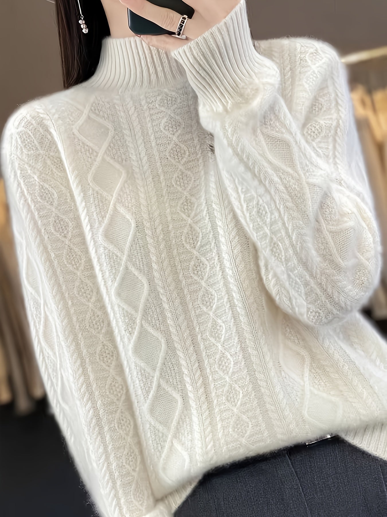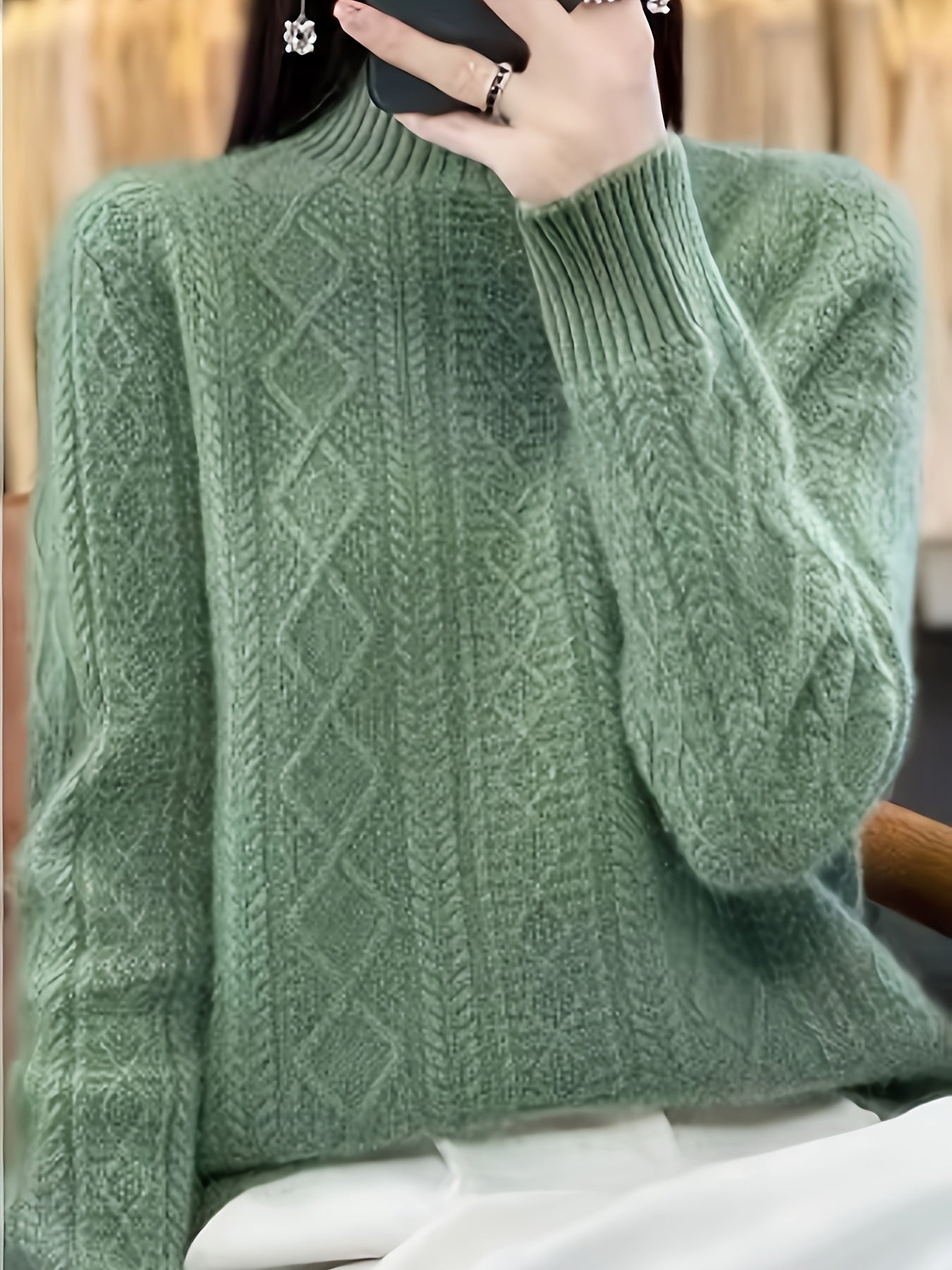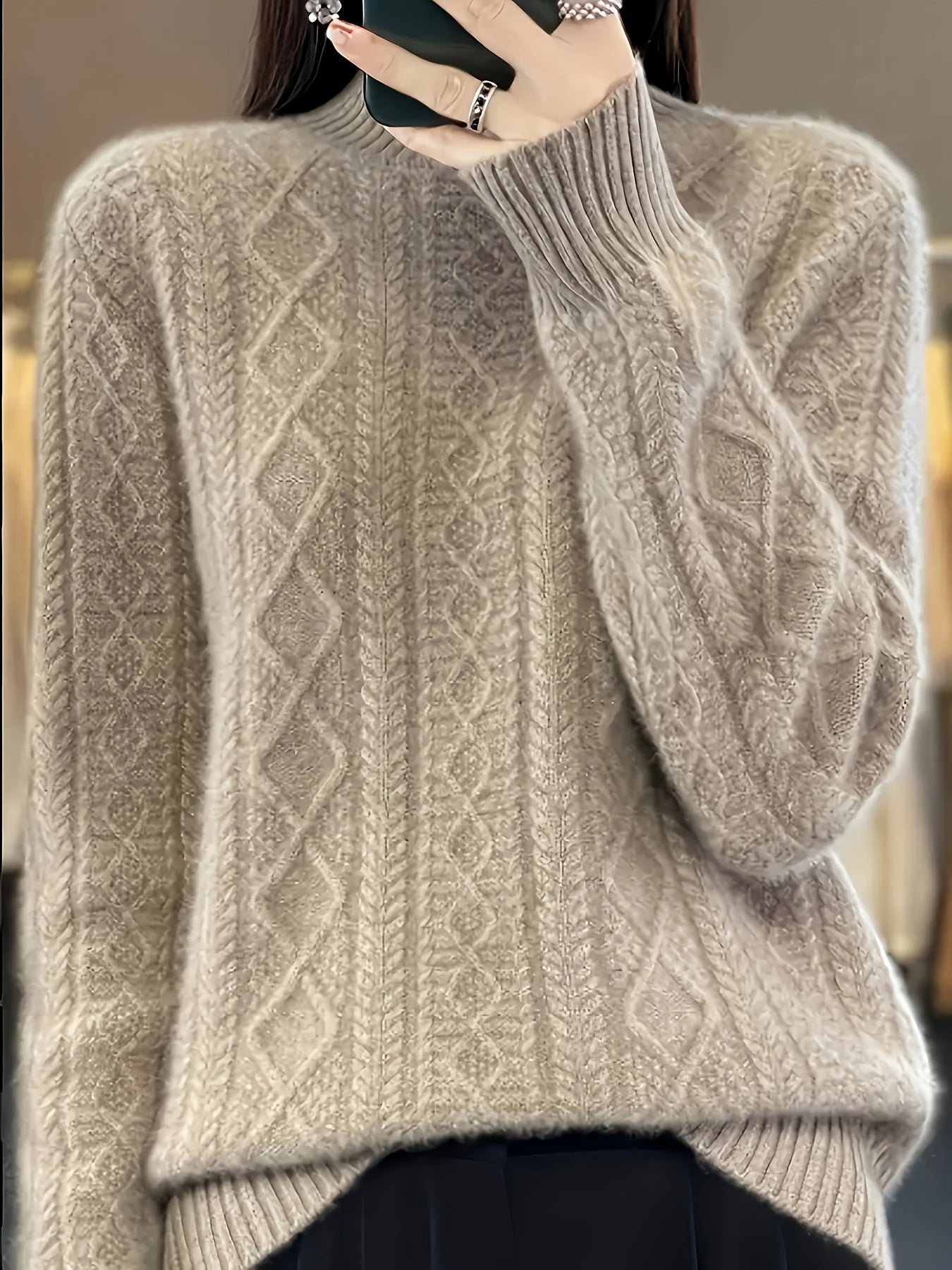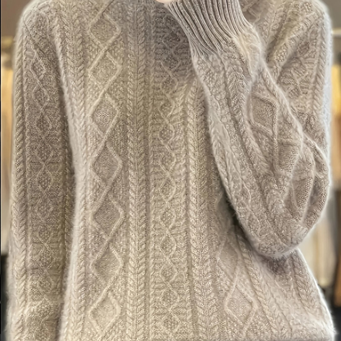 Dieser Pullover vereint klassische Zopfmuster mit einem eleganten Stehkragen. Die strukturierte Oberfläche und die weichen Ärmelabschlüsse verleihen dem Design eine harmonische Form. Perfekt kombinierbar zu Jeans, Stoffhosen oder Röcken – ideal für Alltag, Freizeit oder Büro.