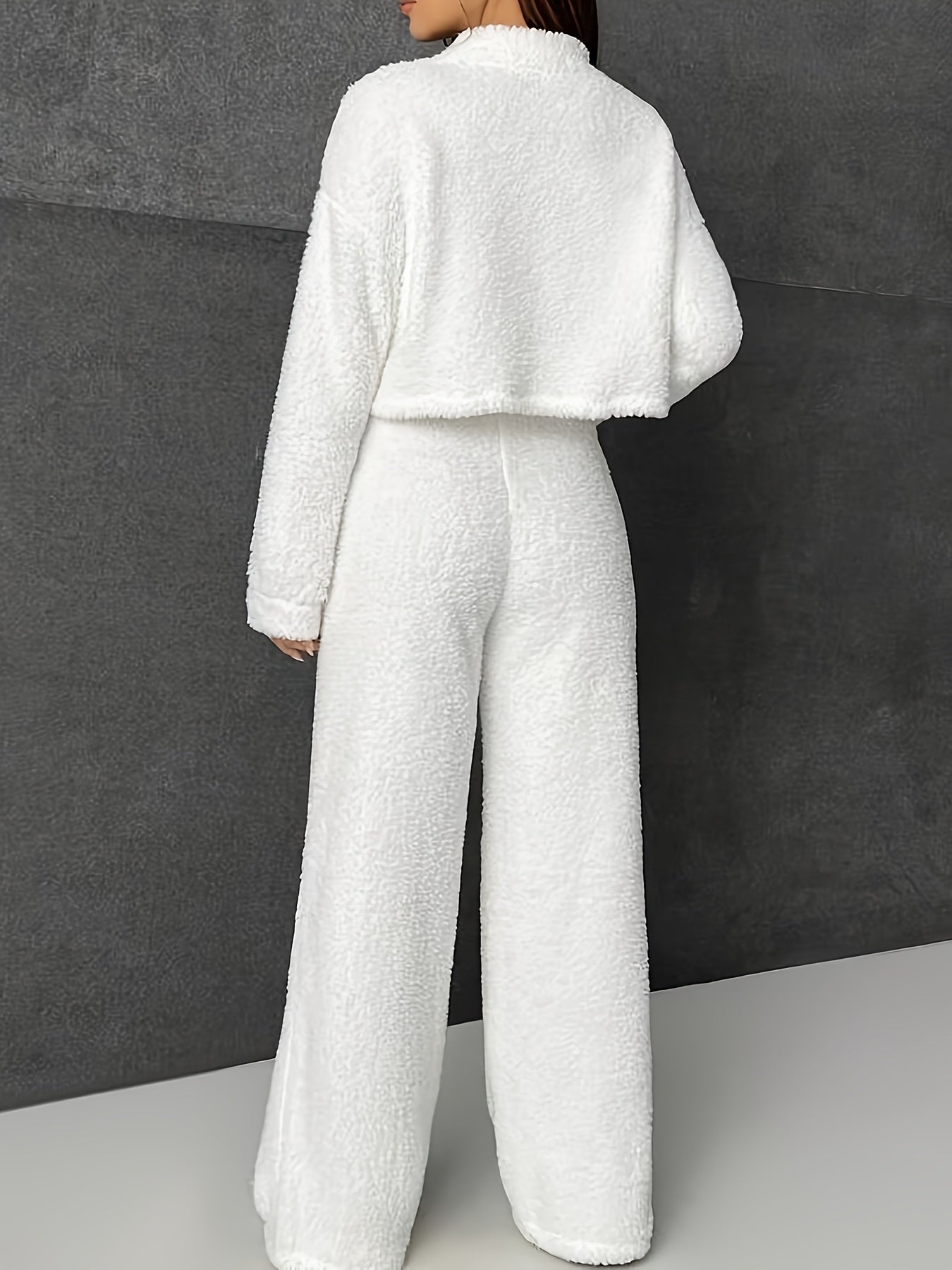 Dieses Set kombiniert einen weichen Pullover mit hoher Kragenlinie und eine weit geschnittene Hose für einen modernen, entspannten Stil. Das einfarbige Design und die flauschige Struktur verleihen dem Ensemble eine stilvolle Note. Ideal für Herbst und Winter – perfekt für gemütliche Stunden oder lässige Alltagsmomente.