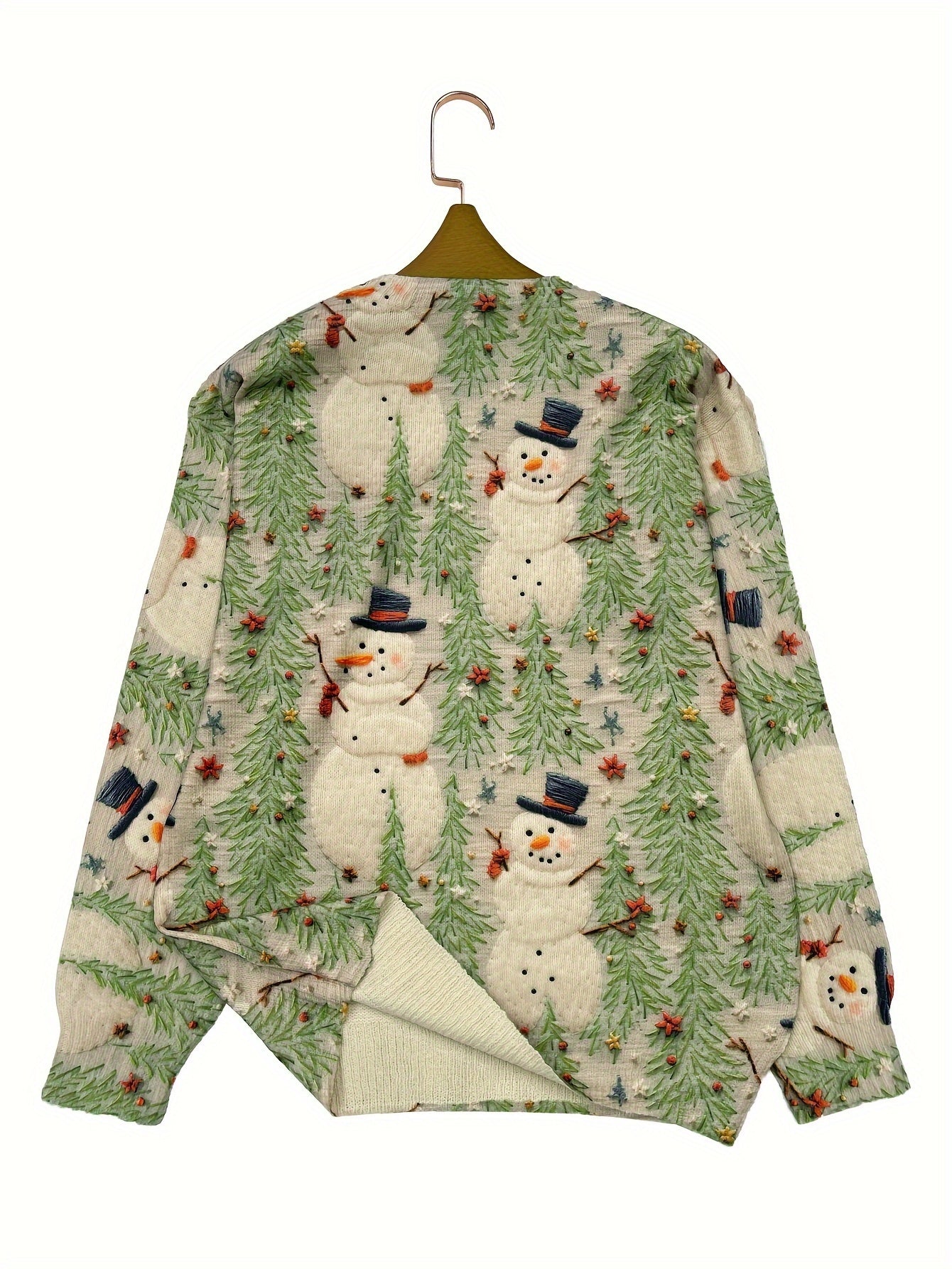Dieser Pullover kombiniert ein klassisches Strickdesign mit einem verspielten Schneemann-Print. Die feinen Tannenbaum-Details verleihen dem Modell eine fröhliche Note und machen es ideal für die festliche Saison. Perfekt für gemütliche Tage zu Hause oder weihnachtliche Anlässe mit Familie und Freunden.